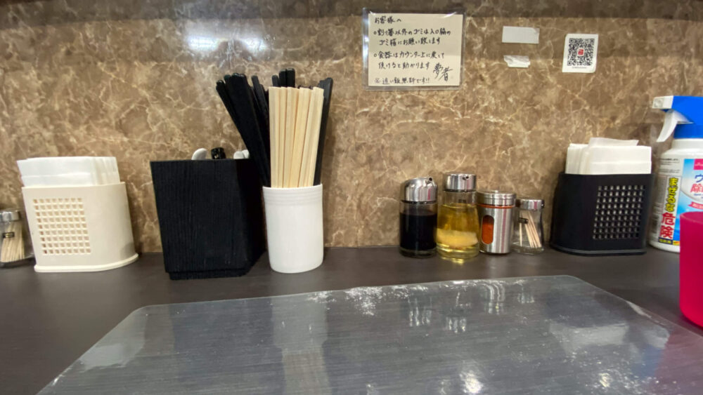 ▲卓上調味料は醤油、レモン酢、一味唐辛子。張り紙には「追い飯無料」とのありがたい記載あり。