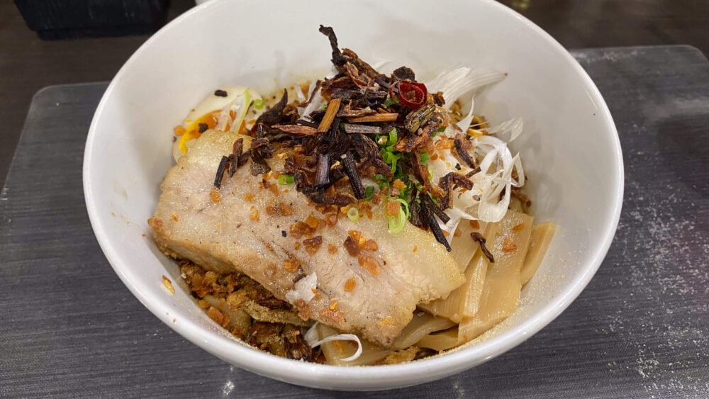 パッと見は黒醤油感を感じないキレイめのビジュアルな汁なし!大きめなチャーシューが魅力的です。