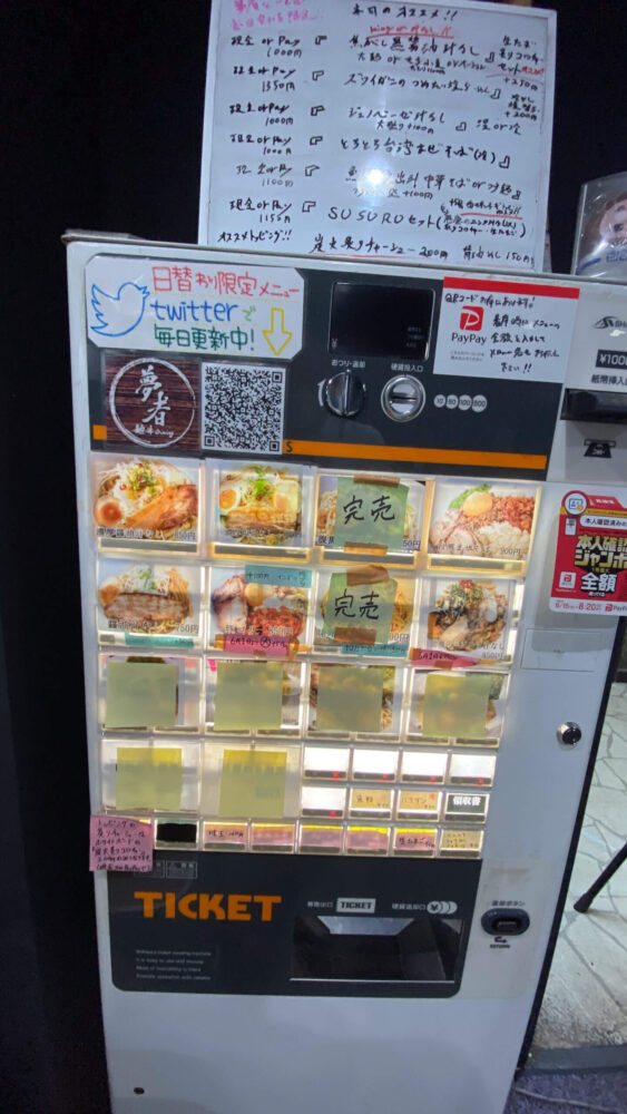 ▲食券機で注文します。食券機上の期間限定メニューは毎日入れ替わり、現金かPayPay払いです。