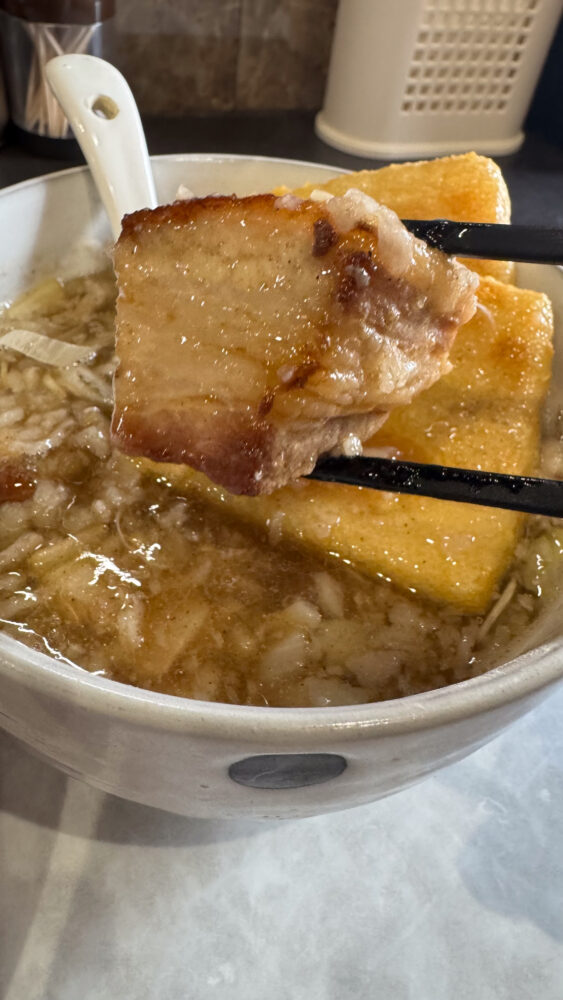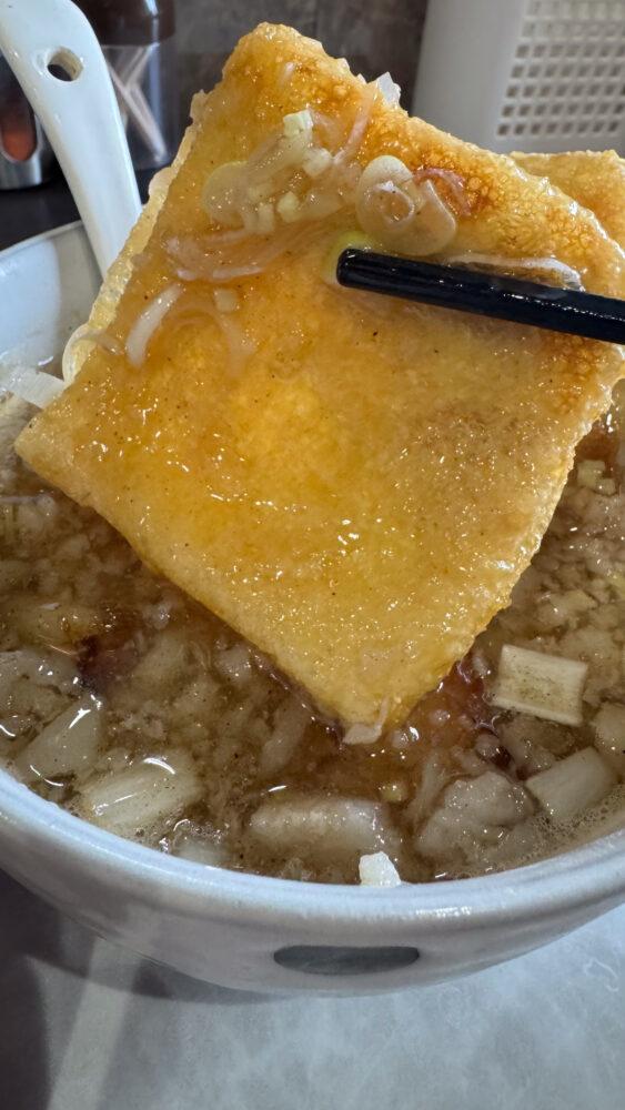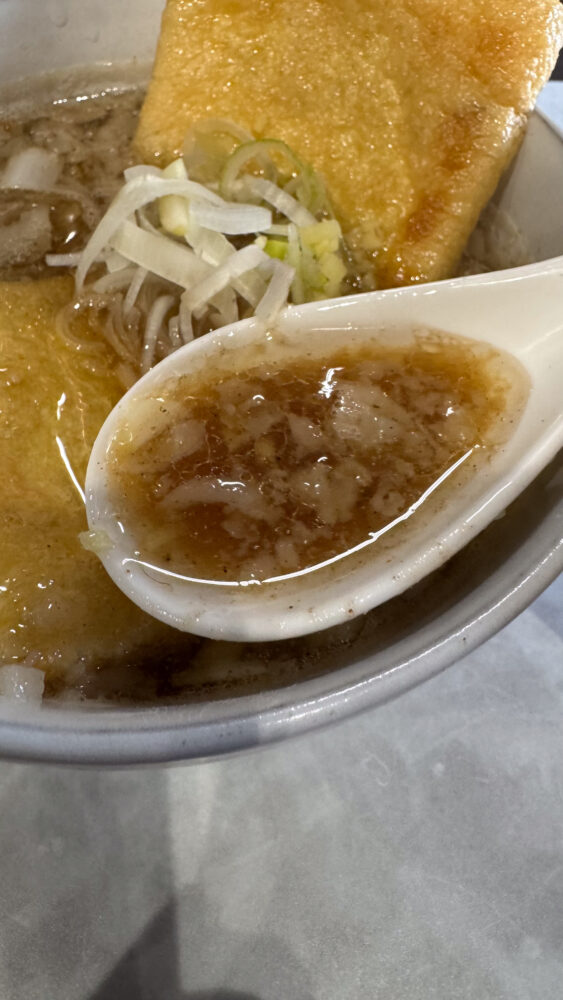 ▲大判の油揚げが旨味の濃いつけ汁を吸って最高に美味。贅沢なトッピングですね。