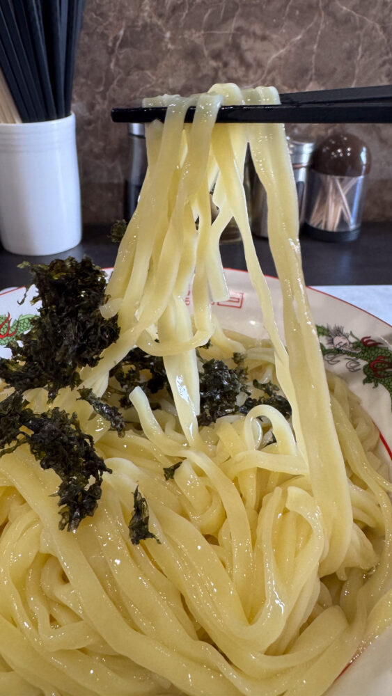 ▲麺は平打ちのツルシコ食感。昆布水のとろみと旨味が加わって美味。岩海苔も良いアクセント。