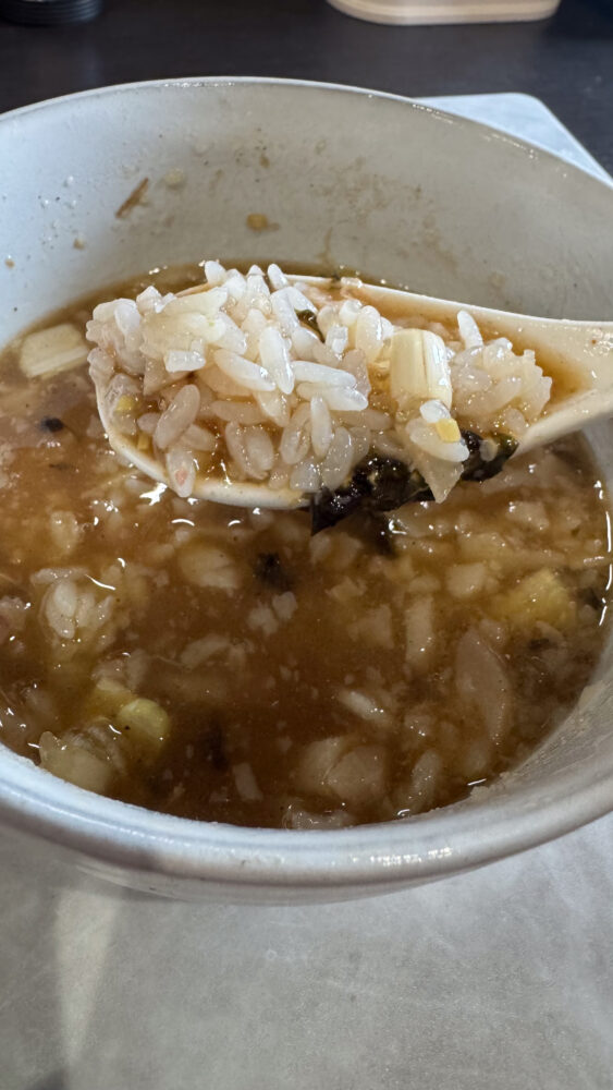 ▲麺を食べ終えたら、締めに追い飯をお願いしました。いろいろな食材の旨味を吸った米が旨い。