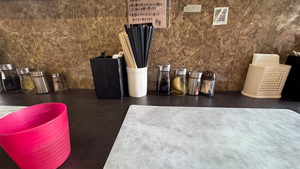 ▲卓上調味料は醤油、レモン酢、一味唐辛子。PayPay用のQRコードも各席に用意されています。