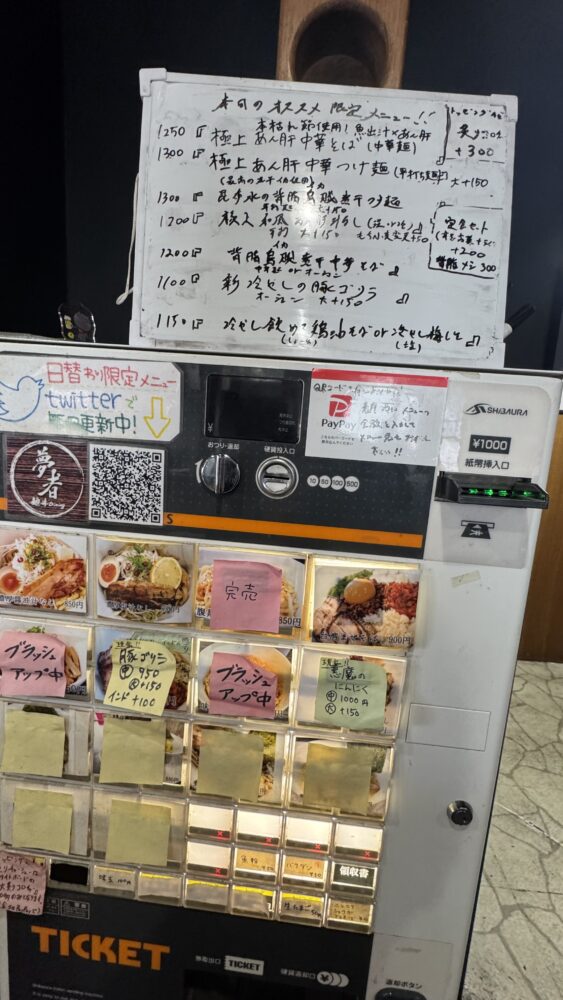 ▲券売機で注文します。券売機上の期間限定メニューは毎日入れ替わり、現金かPayPay払いです。