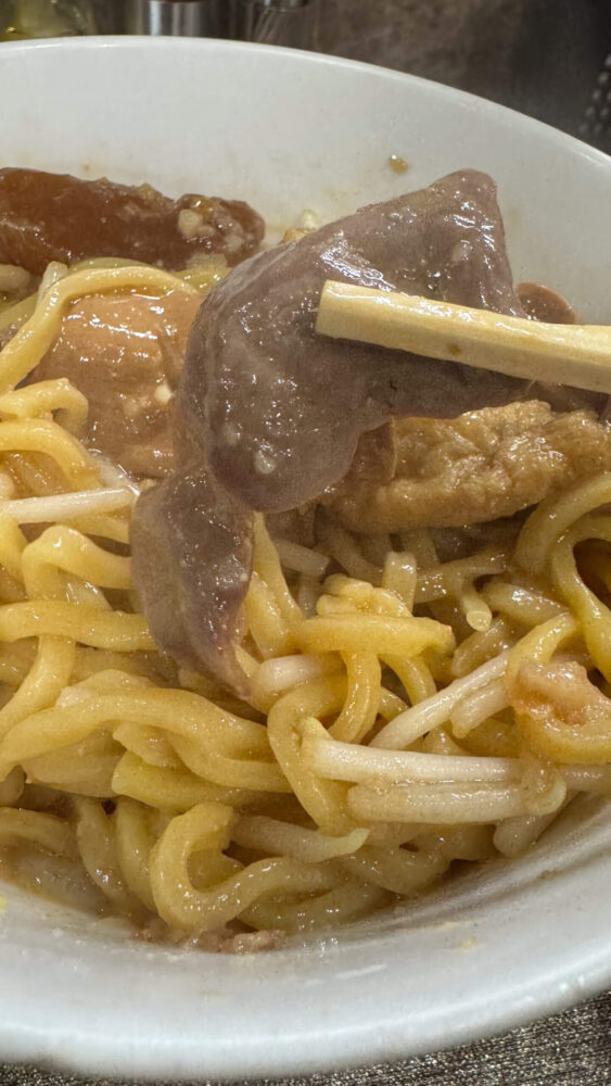 夢者のモツ煮そば(汁なし)は、最初は素朴なビジュアルでびっくりしましたが、プリップリで大ぶりなモツ煮がたくさん入っていて美味でした!