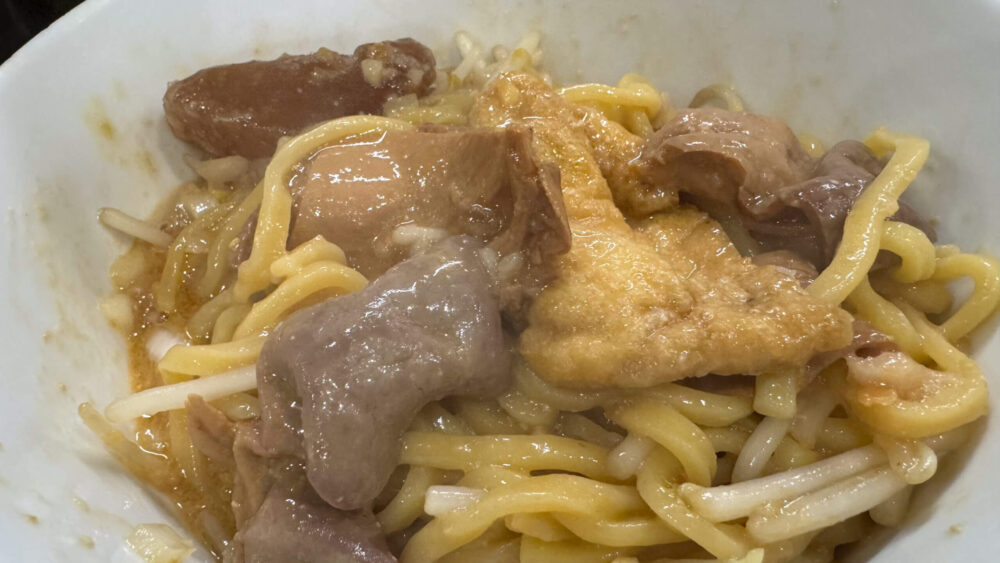 ▲丼の底からしっかりと麺とタレを混ぜ合わせると、大ぶりのモツ煮や油揚げ、大根、もやしが登場。