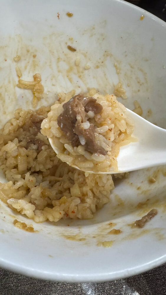 ▲麺を食べ終えたら、無料の追いライスをいただき雑炊風で〆。味噌とモツの旨味が凝縮されて旨い。