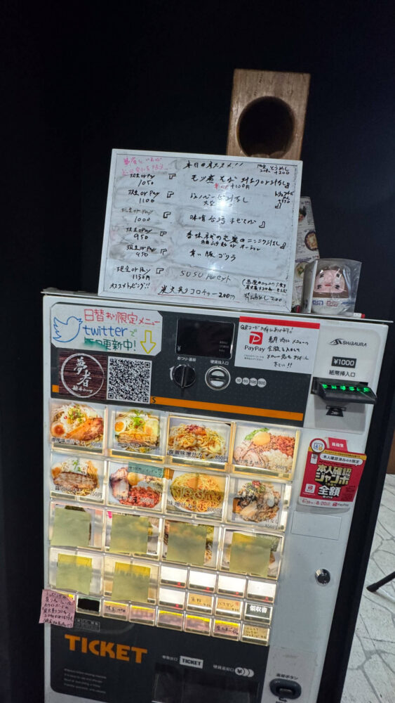 ▲食券機で注文します。食券機上の期間限定メニューは毎日入れ替わり、現金かPayPay払いです。