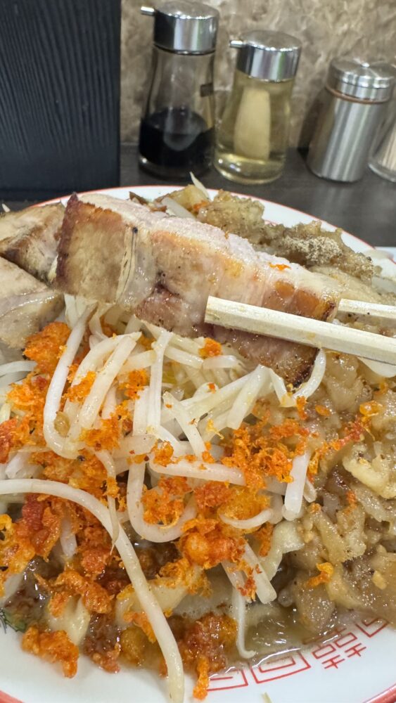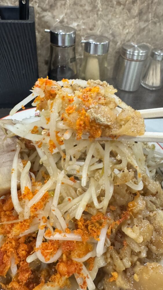 ▲野菜は細めでザクシャキ食感。背脂と辛揚げ、魚粉で食感も旨味がかけ合わさって美味。