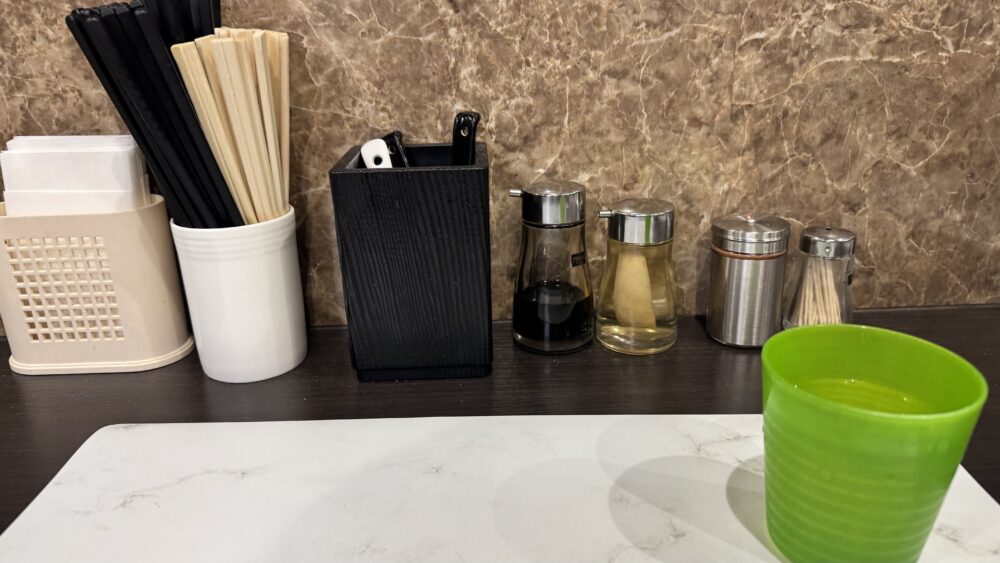▲卓上調味料は醤油、レモン酢、一味唐辛子。PayPay用のQRコードも各席に用意されています。