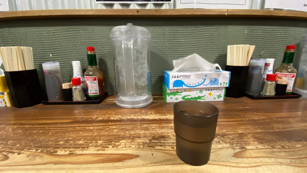 ▲卓上の様子。ティッシュ完備なのが嬉しい。卓上調味料はまぜそばの味変アイテムとしてタバスコやラー油など。