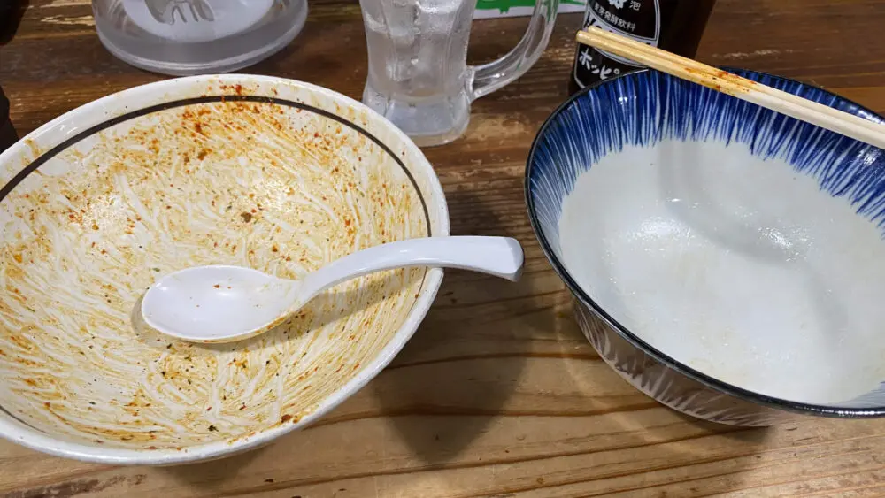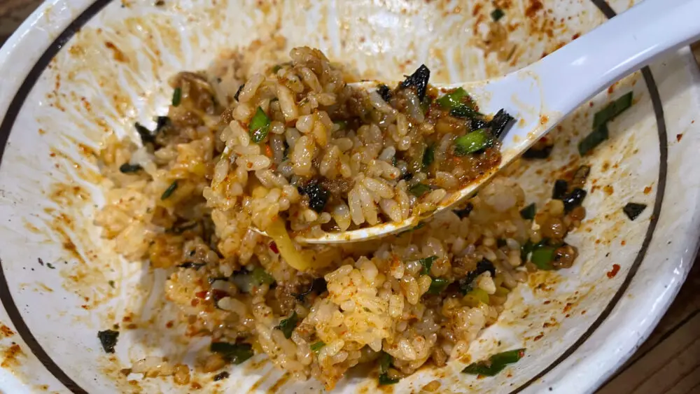 ▲店員さんへ追い飯多めをお願いし、まぜそばの残った具材を混ぜて食べます。これが最高の〆。