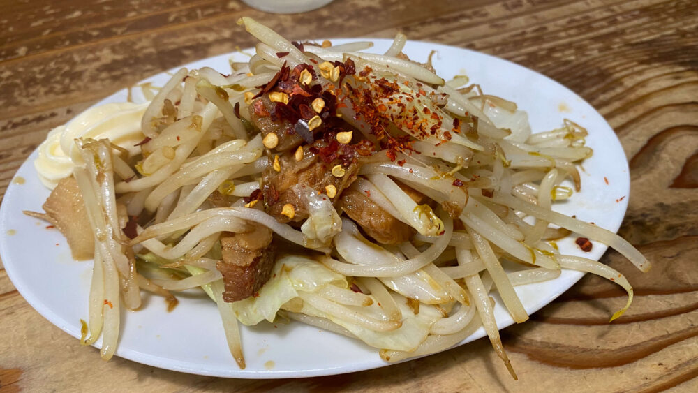 ▲キャベチャー。キャベツともやしと豚肉を炒めたものにフレーク状の唐辛子がオンされています。マヨネーズ付き。