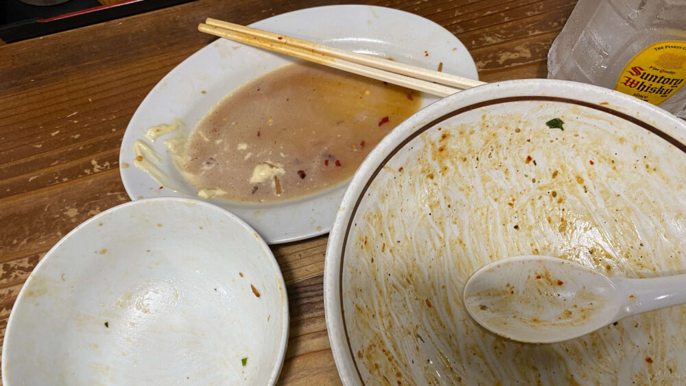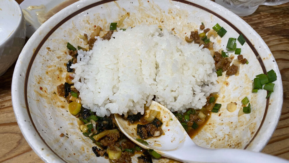 ▲麺をすすり終わったら、店員さんへ追い飯多めをお願いしました。残ったまぜそばの丼へ投入。