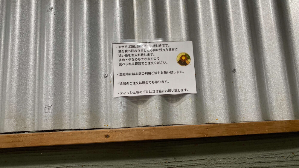 ▲張り紙には、まぜそば類は無料の追い飯付きだと説明書きがあります。多め・少なめも可能です。