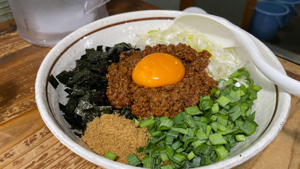 ▲まぜそばが着丼!卵・ひき肉・ニラ・ネギ・魚粉・海苔と豊富なトッピングが食欲をそそります。ちなみにニンニク抜きです。