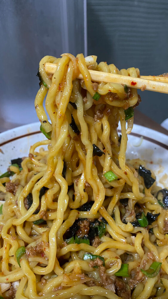 ▲各トッピングの旨味が絡み合ったプリプリな麺が美味。