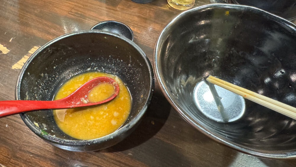 ▲別皿提供だった刻みニンニクをつけ汁に投入。よりジャンクになって中毒性のある美味しさに。