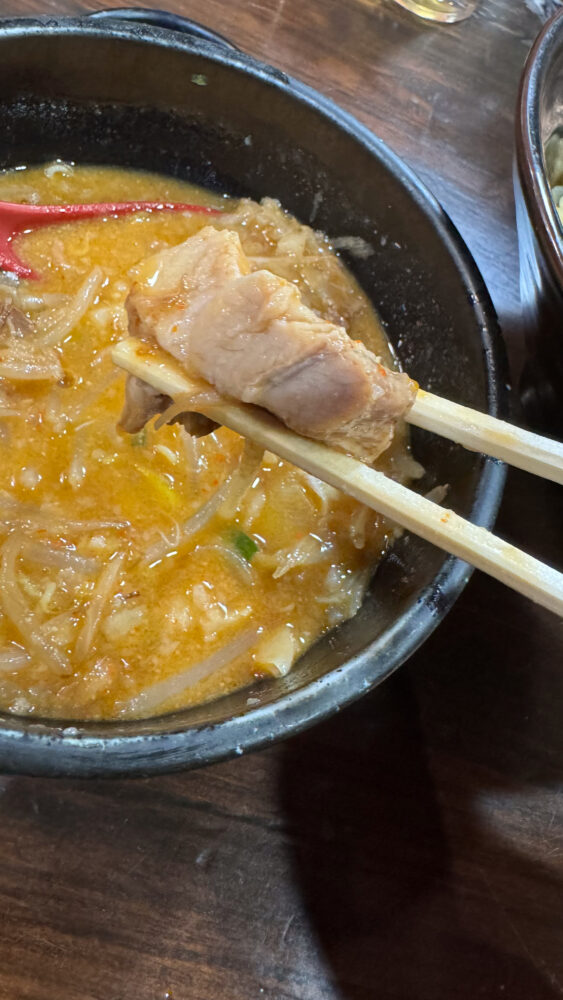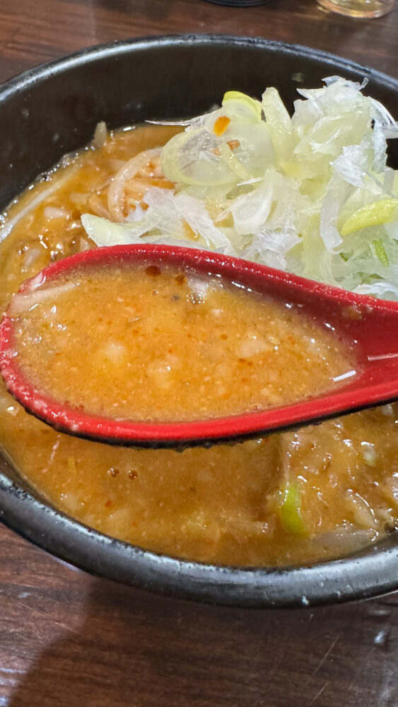 ▲つけ汁の中には野菜がけっこう入っています。クタクタで辛味噌のつけ汁が染み込んでめちゃ旨。