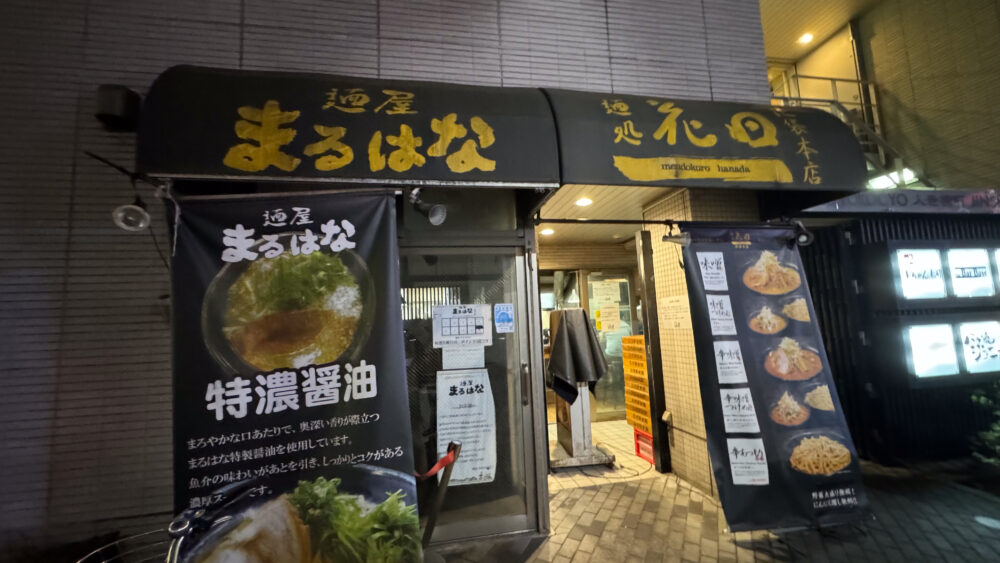 ▲お店は黒と黄色が基調な外観。系列店の麺処まるはなと併設されていますね。