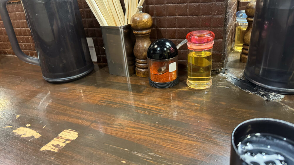 ▲卓上調味料は胡椒や一味唐辛子、お酢。
