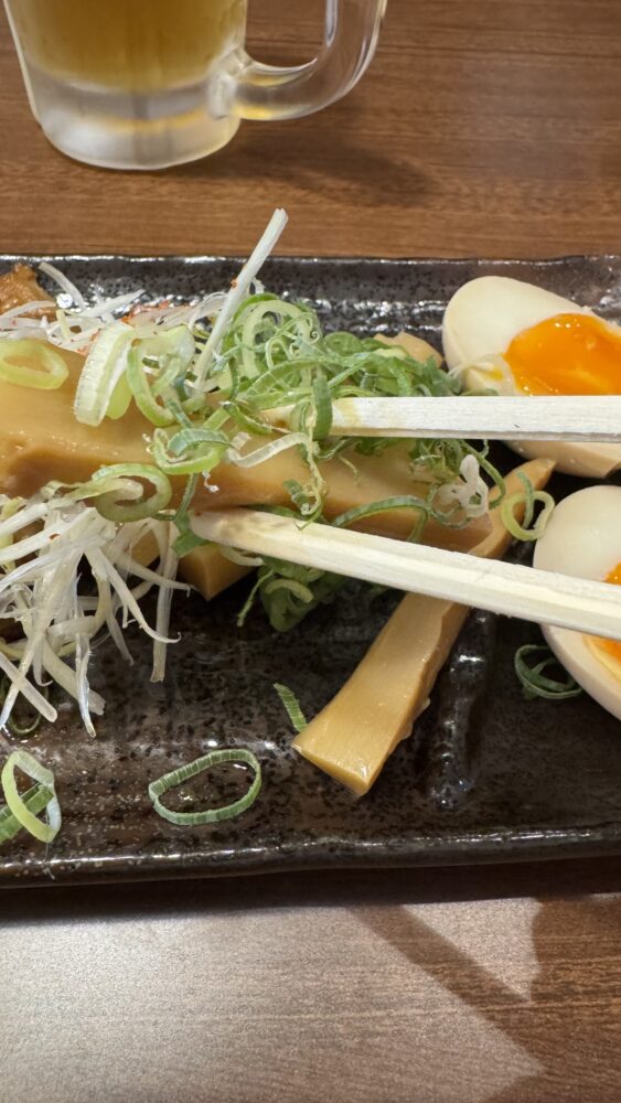 ▲前菜としてラーメン屋の三点盛。味玉・メンマ・チャーシューです。