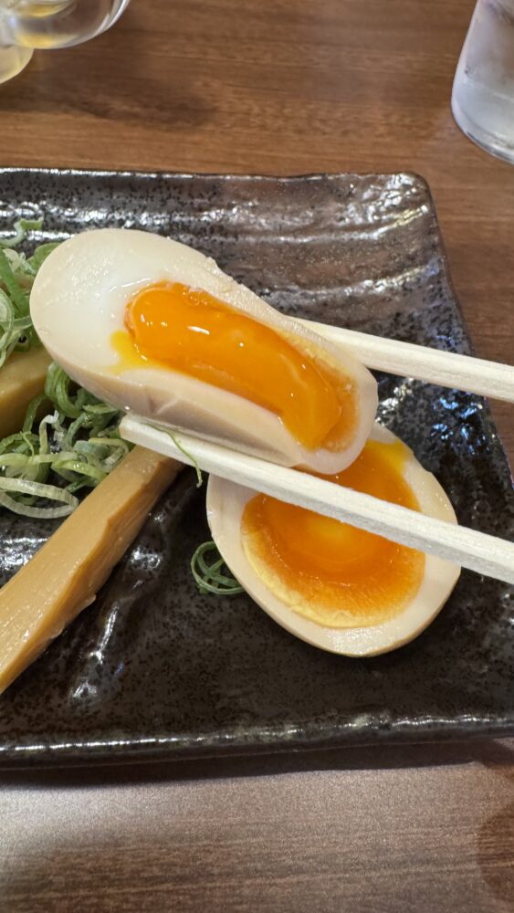 ▲味玉は黄身がとろっと半熟で美味しい。ちょっとラーメン用に温存したくなります。