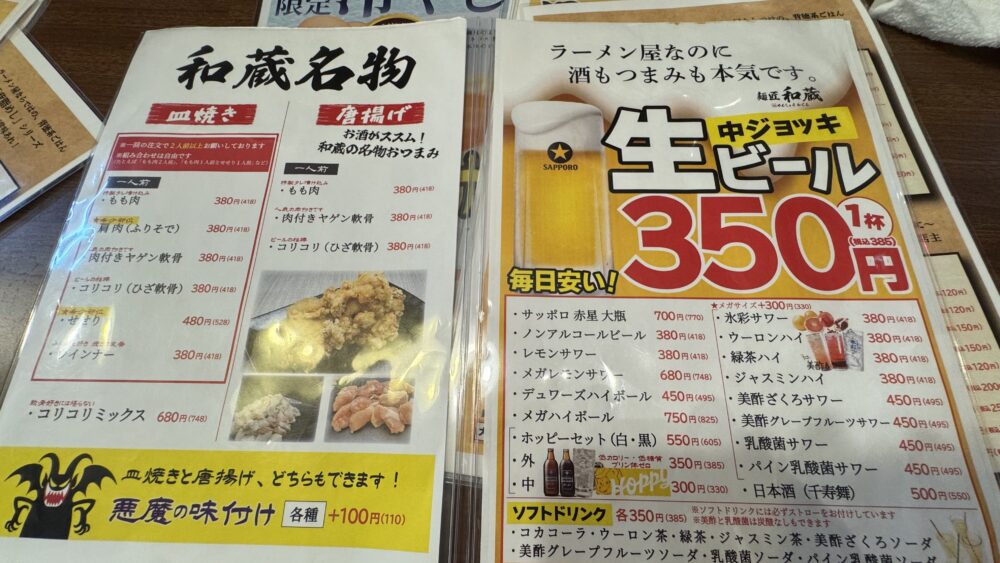 麺匠和蔵は、お酒は安めでおつまみメニューも豊富なので、他にもおつまみを試したいですね。