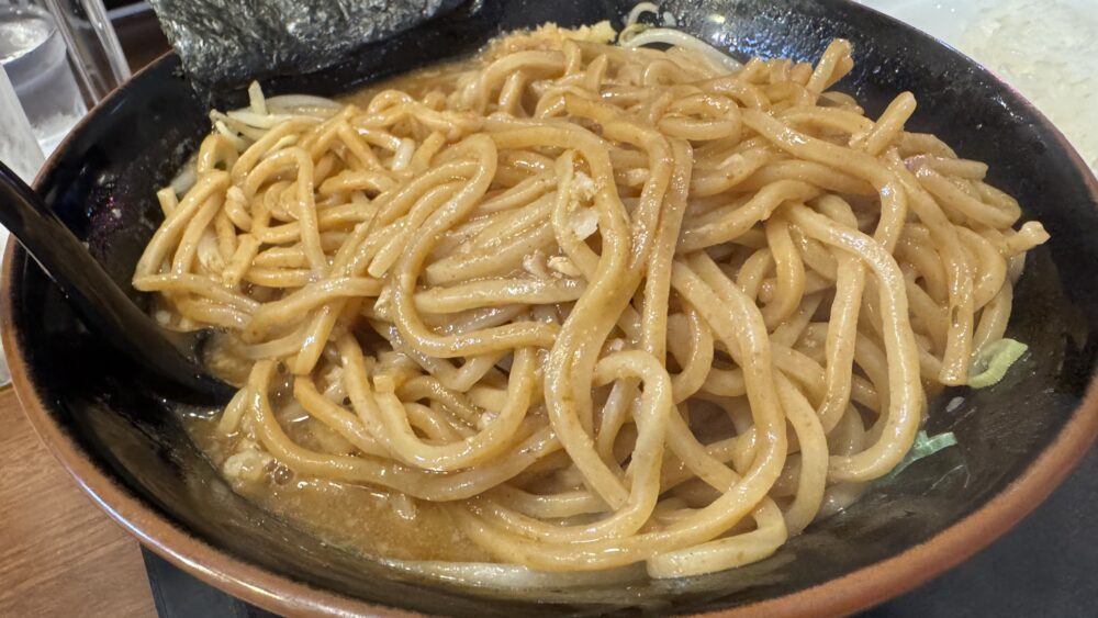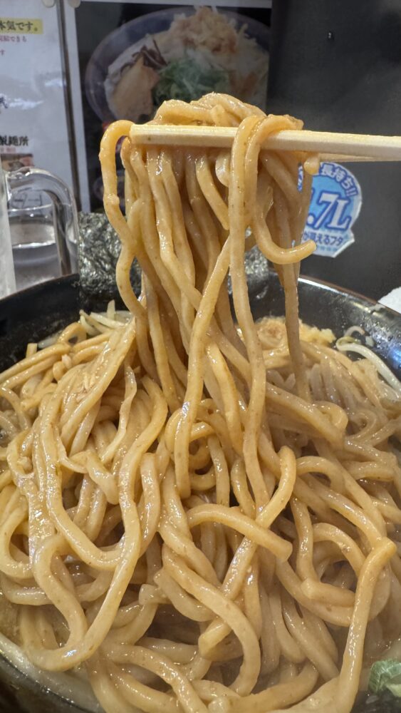 ▲菅野製麺所の麺は多加水ストレートでコシがあります。マイルドなスープをまとって美味。