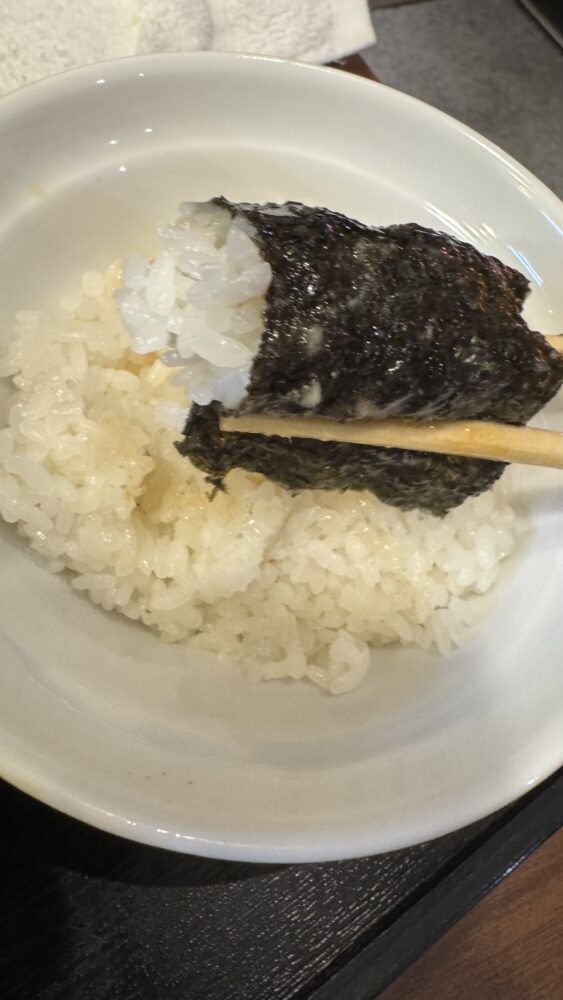 ▲海苔はスープに浸し、小ライスを巻いて食べます。家系とは違った美味しさ。
