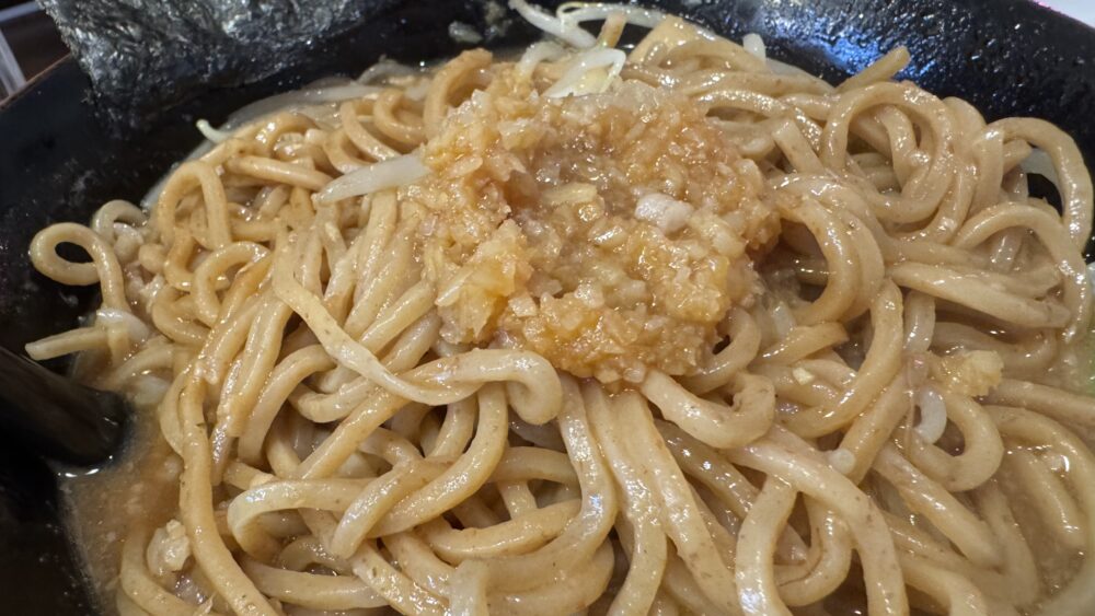 ▲ある程度上物を食べたら天地返し。麺がお目見え。ニンニクは一旦退避しています。
