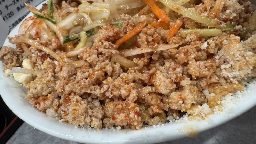 ▲ちょっとカラメに味付けされたミンチは多め。食べ応えとひき肉の旨味が加わって良き。