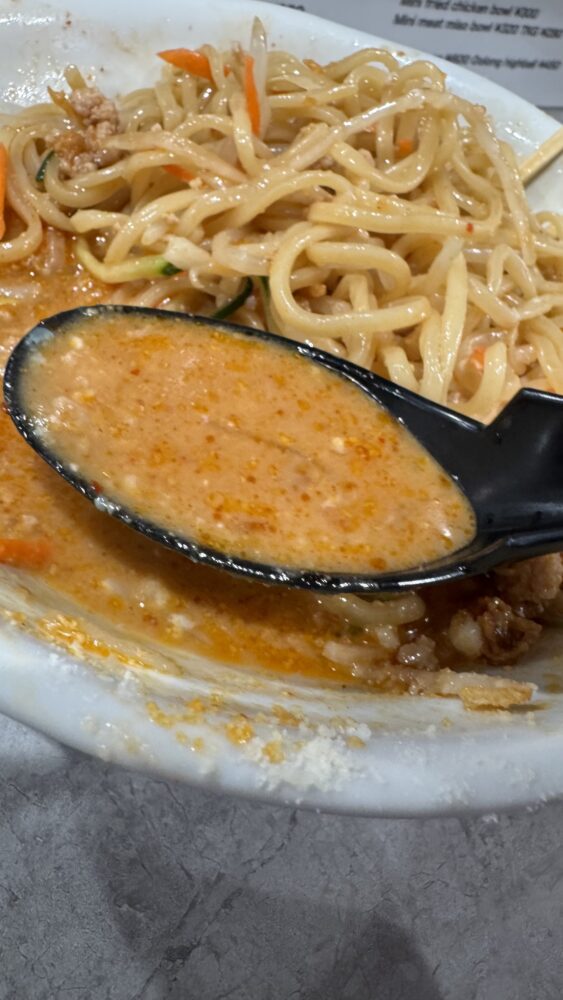 ▲スープは、冷たくてピリ辛で酸味あり。マヨネーズが溶けた部分はややマイルド。