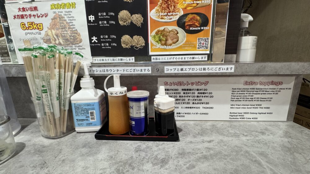 ▲卓上調味料は辛くなるやつ、ブラックペッパー、醤油、お酢、一味唐辛子、すりごまという構成。