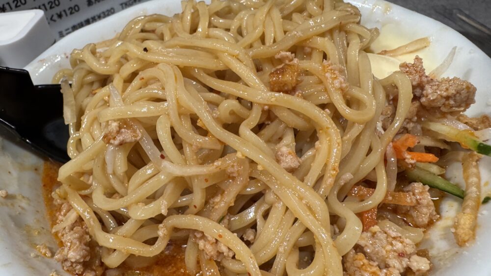 ▲麺は、冷たくてコシが強く、ピリ辛で酸味のあるスープが絡んで美味。