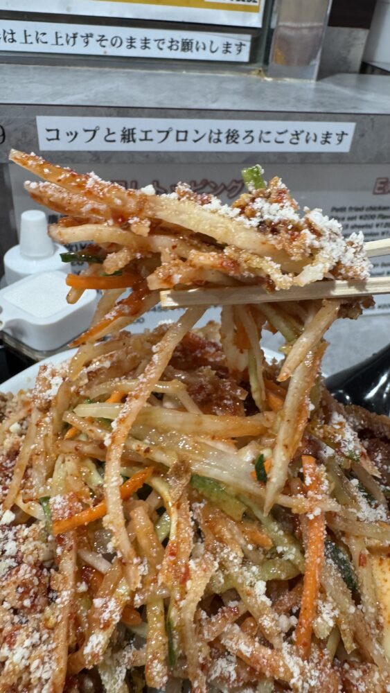 ▲野菜は、もやしだけじゃなく、細切りの人参や大根、きゅうりもあります。中華春雨サラダ的な味付けに粉チーズが美味。