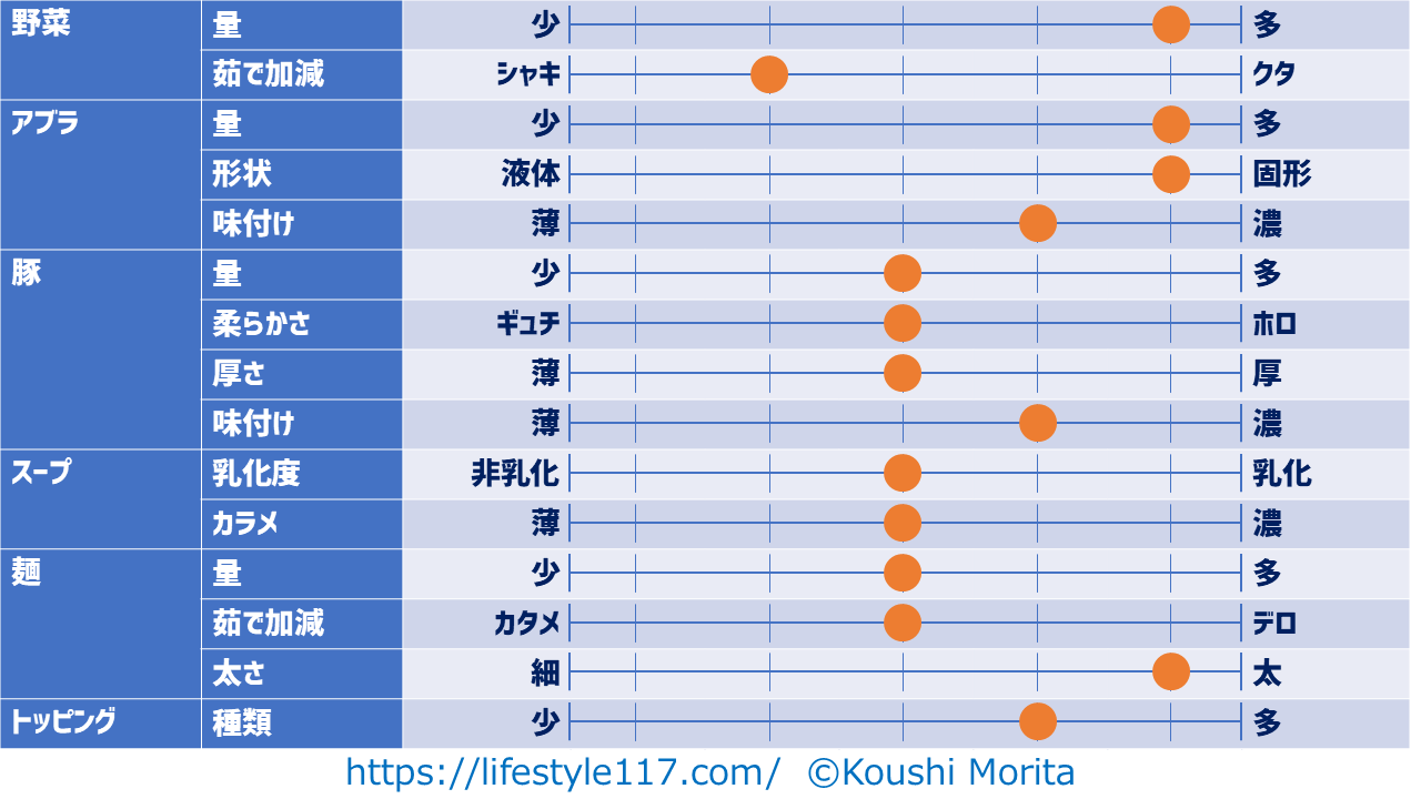 - アブラ(無・少・普・ちょいマシ・マシ・マシマシ)