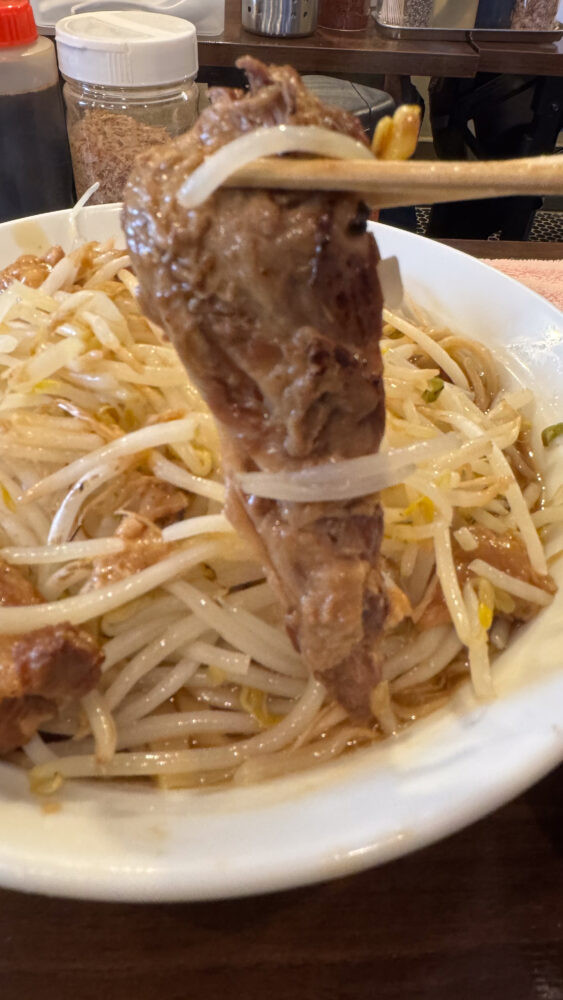 ▲二郎系で珍しいソーキ。炙ってあるので香ばしい。ムッチリとコリっと感が混在する不思議な食感。