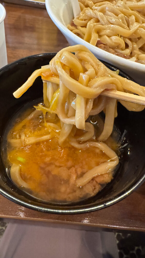 ▲ある程度上物を食べてから天地返し。ソリッドで極太な麺が美味しそう。