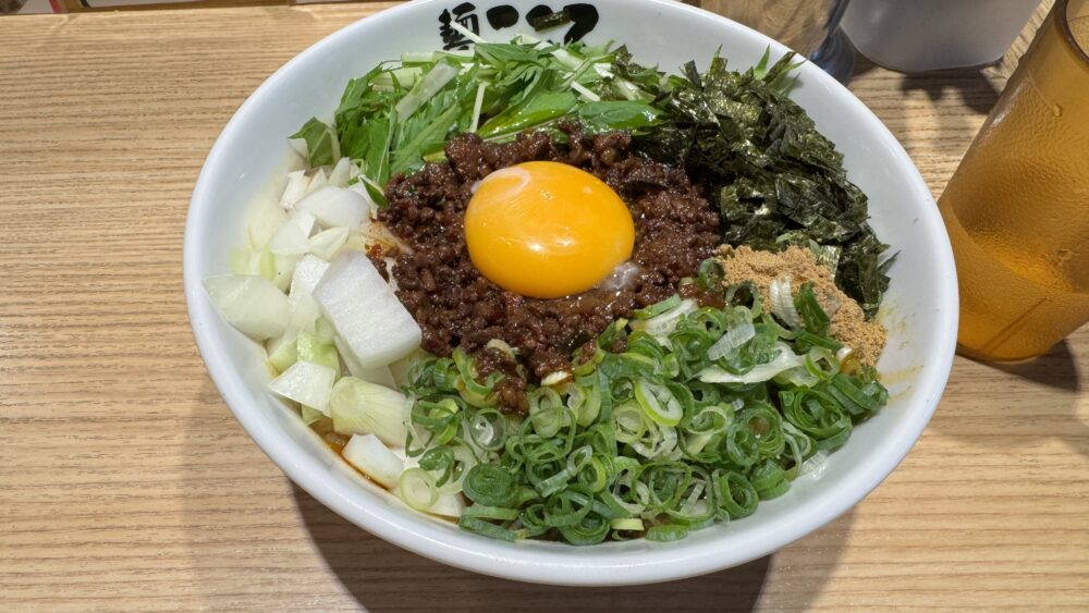 カレー台湾まぜそばが着丼!卵黄に台湾ミンチ、青ネギ、玉ねぎ、水菜、海苔、魚粉と彩り豊かで美味しそう!