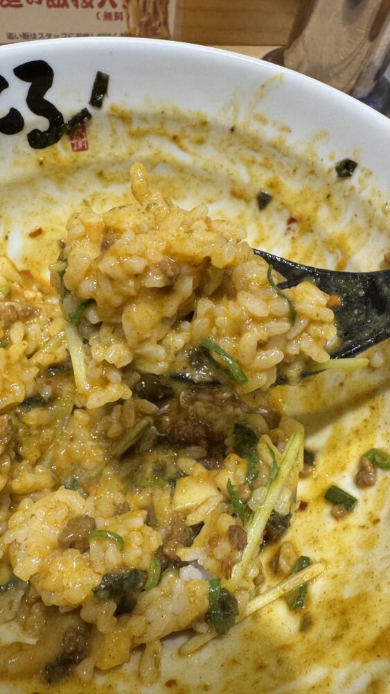 ▲麺を食べ終えたら店員さんへ追い飯をリクエスト。カレーライス風の雑炊を楽しめて最高。