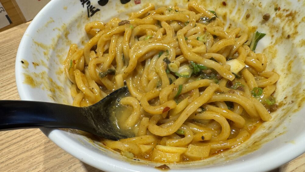 ▲最初に麺を具材やタレとしっかり混ぜ合わせていきます。カレーの香りが漂い、めちゃくちゃ美味しそう!