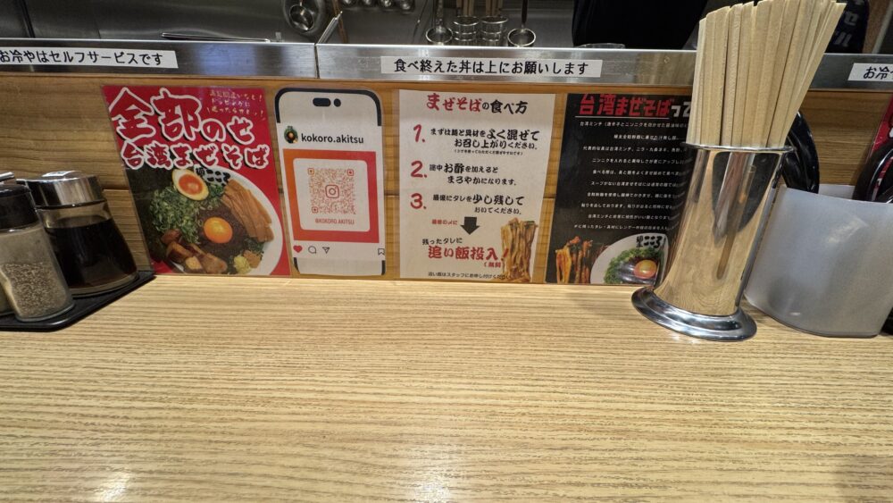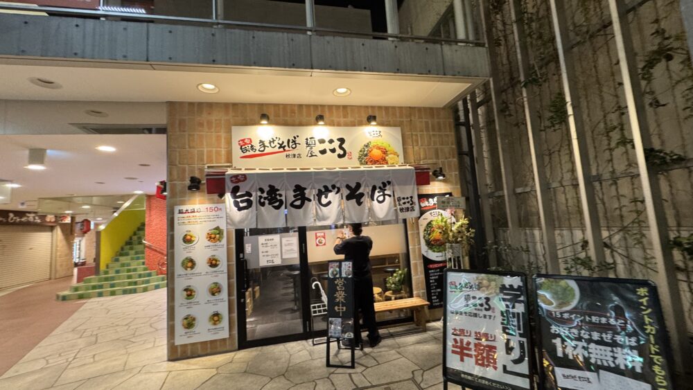▲秋津クロスコートにあります。サイゼリヤの目の前。看板はモノトーンで台湾まぜそばの写真も目立ちます。