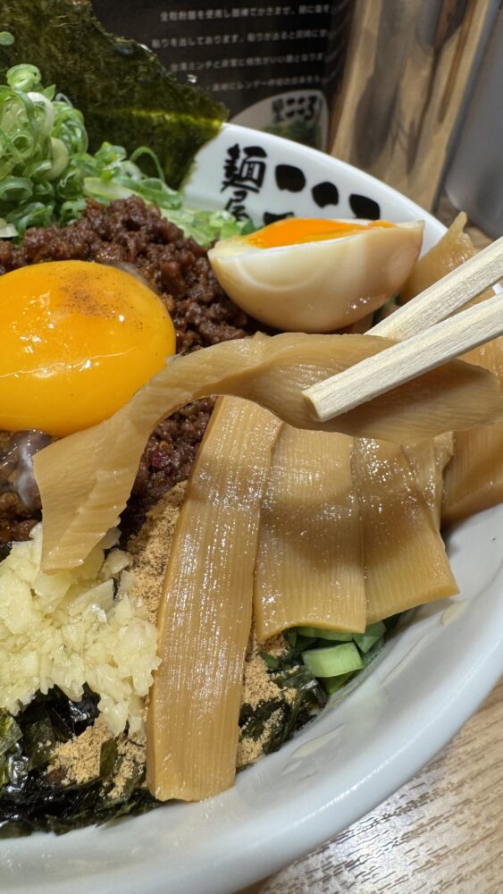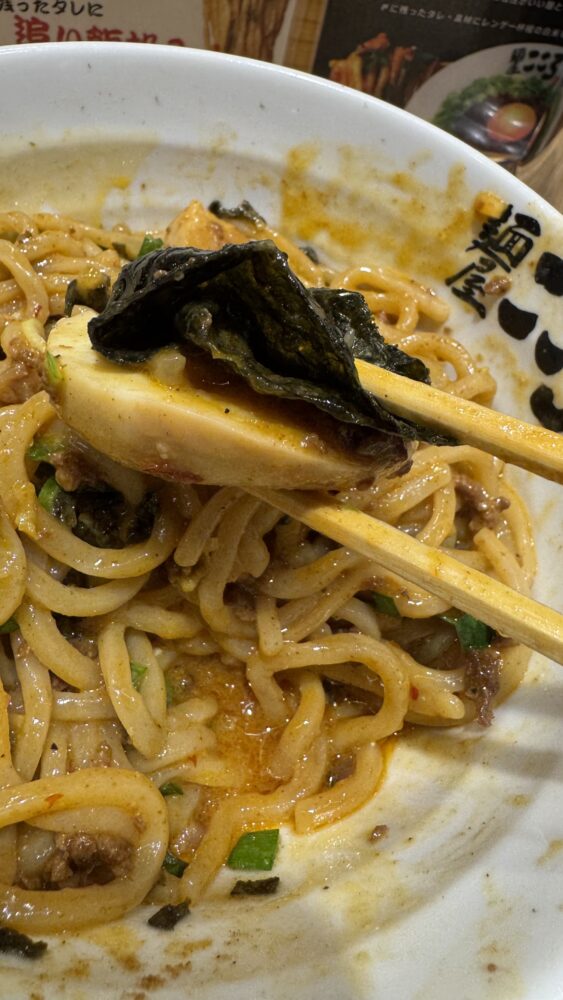 ▲麺はモチっと食感で、魚粉やタレ、ミンチなどの旨味が絡んでめちゃ旨。