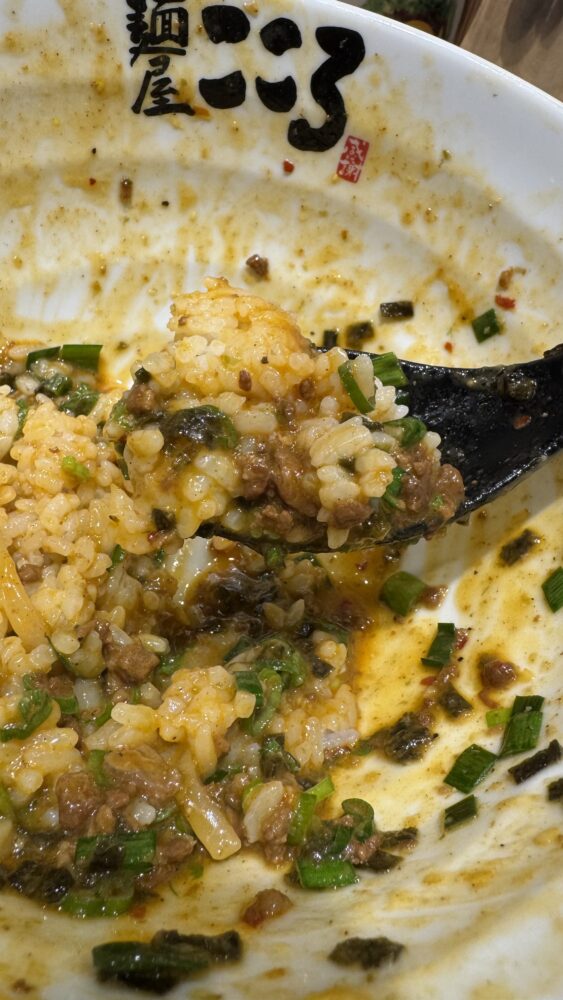 ▲麺を食べ終えたら店員さんへ追い飯をリクエスト。残ったタレとミンチがライスに絡んで最後までめちゃ旨。