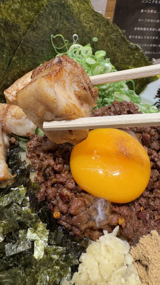 全部載せ台湾まぜそばが着丼!ゴロゴロチャーシューに九条ネギ、味玉、メンマ、のりがプラスされ豪華な一杯!