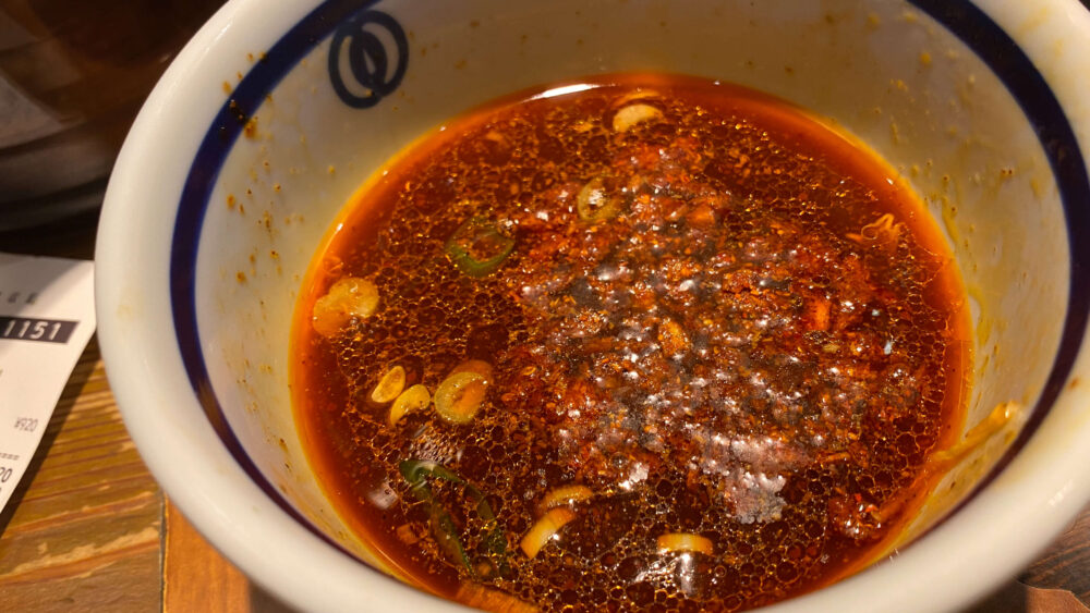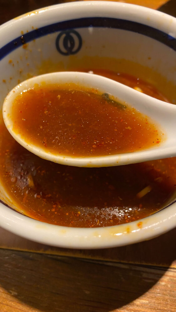 ▲つけ汁は思いのほか辛さはマイルド。ただ山椒が効いたカラシビ系。麺に絡めて食べると美味しい。