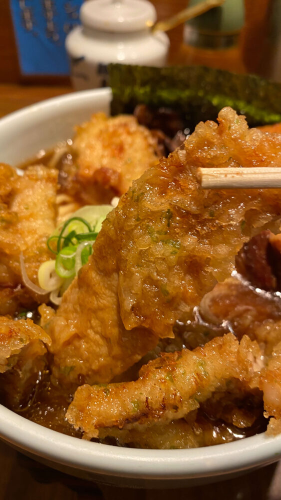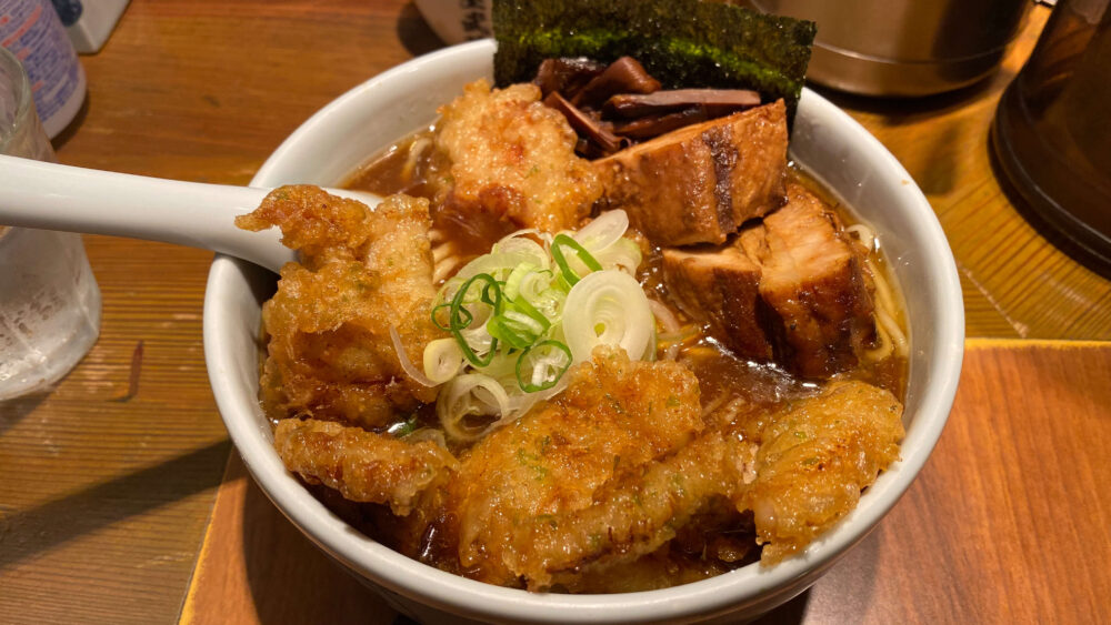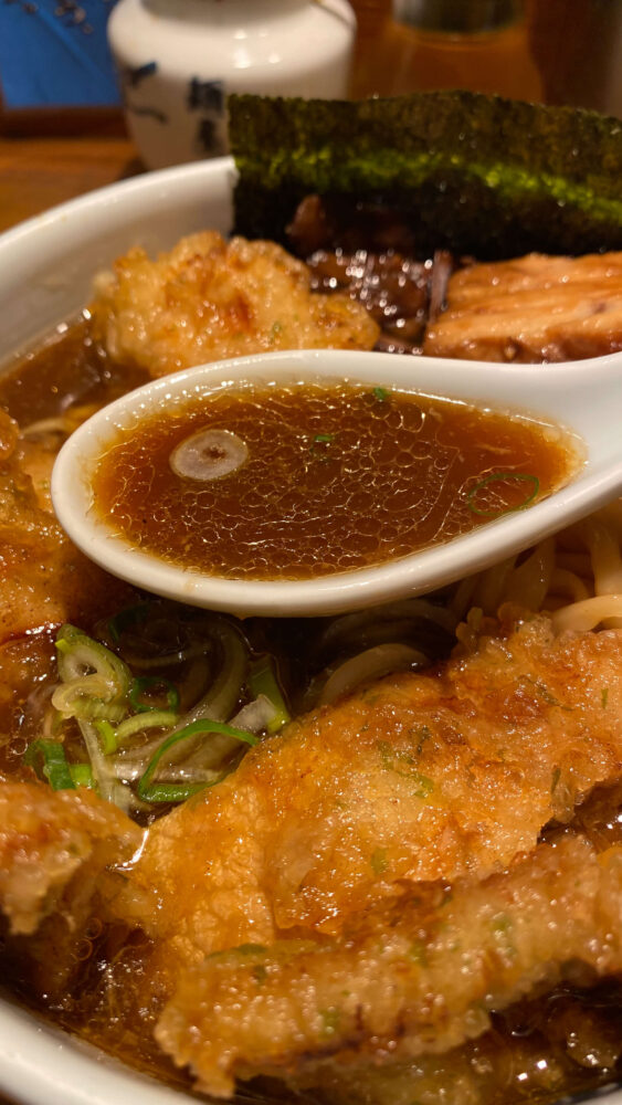 ▲サクサクとクリスピーな豚天。衣をスープで浸して食べると食感も変わり、こちらも美味。