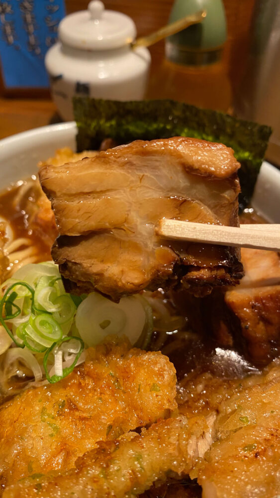 ゴロっとした大きめな角煮やふんだんに盛りつけられた二天が肉好きにはたまらなく豪華な一杯!