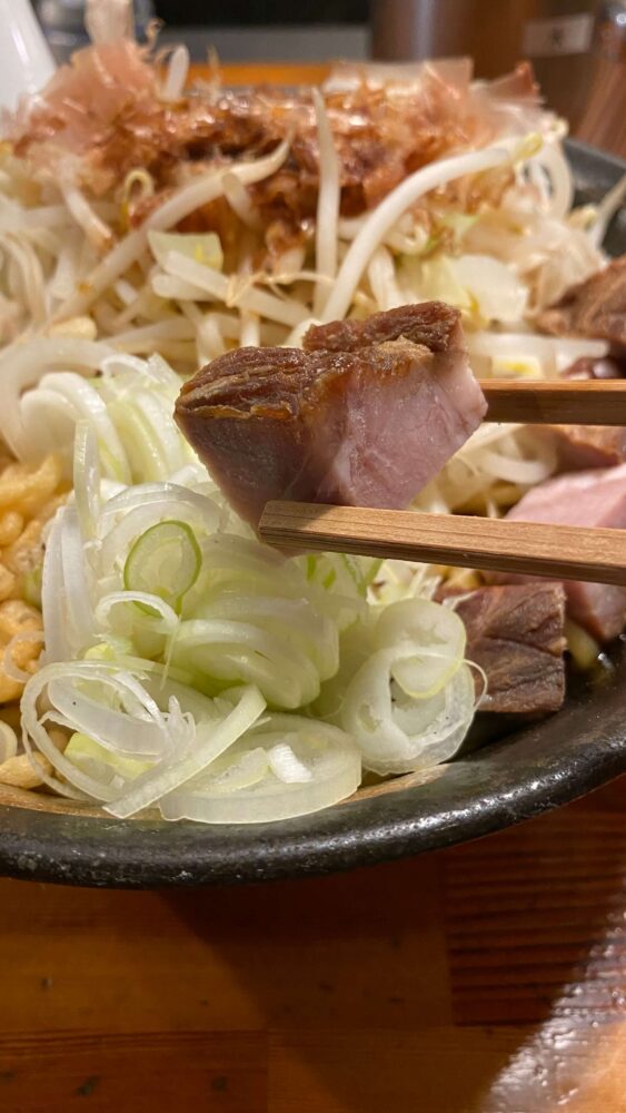 二郎系といえば「豚」ですが、まぜそばっぽさを保つためにあえて角切りチャーシューにしたのでしょうか?